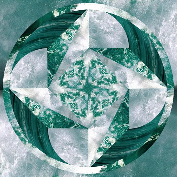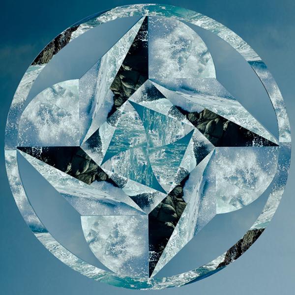Crush (2014): Created using mandala designs as templates for raster image collage. The patterns repeat, as do the pieces of the jpeg cut and copied. The photo used is a crashing wave. There is another design called ‘Thirst’ which was made using the same process.